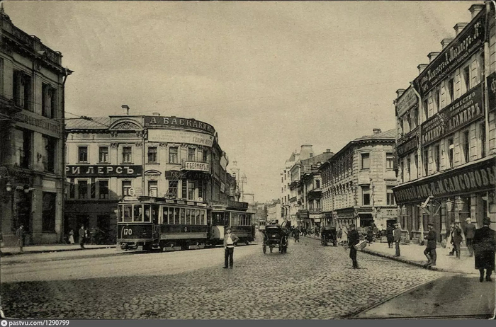 Мясницкая улица от Бульварного кольца в сторону Садового, 1910-1914. Автор фото: А.А. Губарев. С сайта www.pastvu.com.
