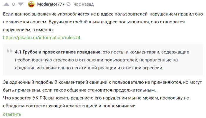 В связи с чем, предлагаю не игнорировать подобные высказывания. Да, модераторы будут реагировать только в том случае, если оскорбление касается пользователей Пикабу, однако, если мы перестанем игнорировать такое отношение к себе и мото сообществу в целом, то регулярные нападки от одних и тех же лиц в любом случае не останутся без кары.