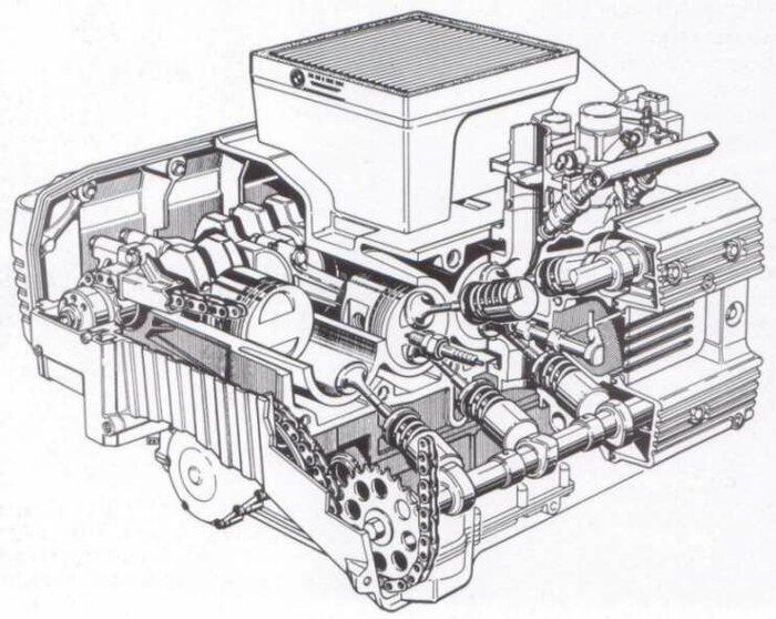 Получившийся новый мотор со сцеплением, стартером и блоком впрыска весил 76,5 кг – что было по тем временам очень немного.