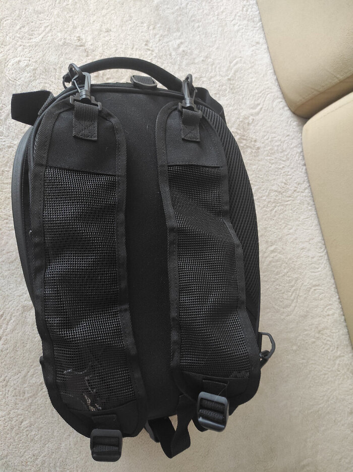 Так как это рюкзак, сзади к нему крепятся лямки, на пластиковых карабинах. Качество лямок мне не понравилось, выглядят они хлипко, а резиновая сеточка по ощущениям долго не прослужит. Хорошо, что их можно отцепить и убрать в дальний карман рюкзака.