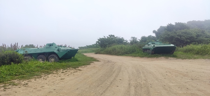 Дорога, конечно, не фонтан, как говорится. Попадаются и ямы, и участки с откровенно плохой поверхностью, и грязь. Но самое, что меня заставило понервничать - почти полное отсутствие заправок. Не то, чтоб искал более-менее приличные, на резерве кое-как доехал до первой попавшейся, на которую в нормальной ситуации даже и не посмотрел бы.)) Пара старинных, со стрелочным указателем, ржавых колонок, "бензин" и "диз.топливо", домик-будка, за ней пара ржавых тракторов и что-то похожее на остов уборочного комбайна. Атмосферненько. И дождь не прекращаясь... На краю площадки фура, с откинутой кабиной старого тягача, и лязг металла откуда-то снизу из-под него. Но, спасибо, хоть так. Оплата только наличными, полный бак, т.к. навигация не предполагала обилие АЗС на пути. Едем!