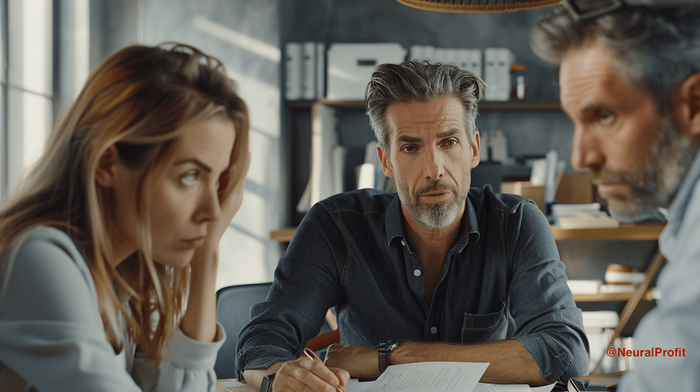 three people conferring in an office, a girl on the left is touching her hair with her hand, a man in the center is tapping a pen on a desk (Три человека беседуют в офисе, девушка слева трогает рукой свои волосы, мужчина в центре постукивает ручкой по столу)