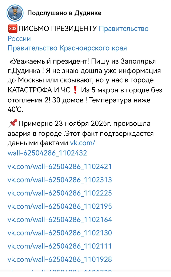 Сижу сегодня в ВК и тут попадается такой комментарий, ссылки направляют меня на группу "Подслушано в Дудинке" https://vk.com/pvdinddk , в которой активно обсуждаются проблемы жителей Дудинки.