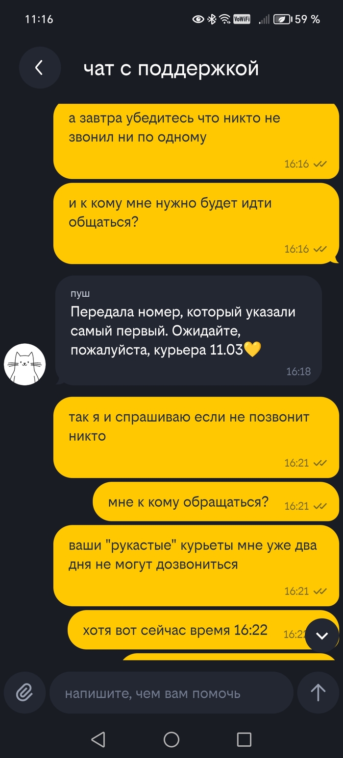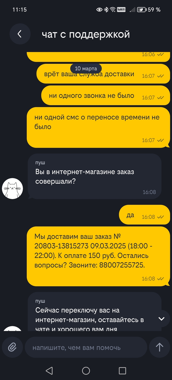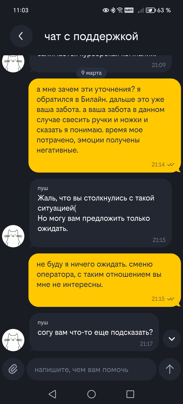 В выходные озадачился приобретением симки для младшего, скоро школа и все такое. 08.03 оформил заявку в приложении, мне тут же позвонила девушка из Билайн шопа и согласовала все нюансы. Доставка должна была быть с 18-22 09.03.2025. Пока вроде всё идёт хорошо, вопросов нет. Настает вечер 09 марта и до 21 тишина: ни звонка курьера ни смс (все проверяю и спам и были ли пропущенные). Начинаю обращение к оператору через приложение.
