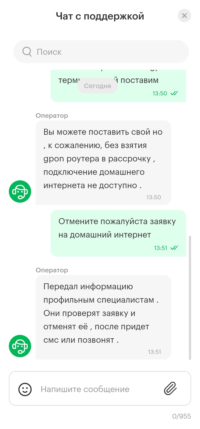 Звонит оператор, говорит что мой роутер может не подойти, нужен gpon терминал т. к. подключение оптоволоконное. Она сказала только о том, что нужно будет платить 175 рублей в месяц. Конечно никто не говорил что это рассрочка. В переписке с поддержкой выяснилось, что этот роутер стоит 6 тысяч.. Посмотрел на озоне, решил просто взять свой и пусть подключают через мой терминал. В итоге получаю такое сообщение: Вы можете поставить свой но , к сожалению, без взятия gpon роутера в рассрочку , подключение домашнего интернета не доступно .
