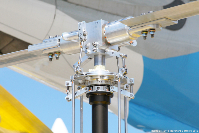 Также есть достаточно хорошего качества фотография этого элемента конструкции, на которой можно легко различить одну из двух (индивидуальные для каждой лопасти) тяг проводки управления шагом РВ с вырванным из лопасти кронштейном:
