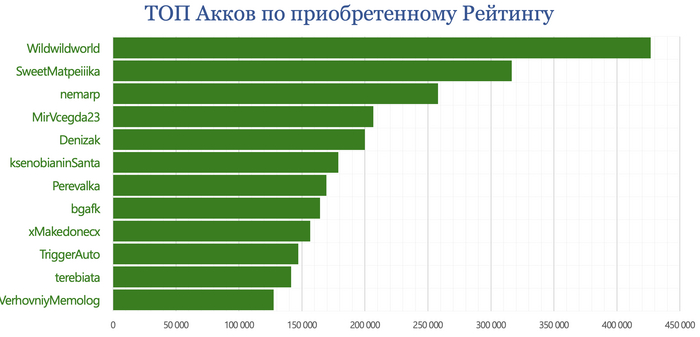 Zolotieruki - постов опубликовано 472, рейтинг за них 25 209; Stroyka1111 - постов 370, рейтинг за них 26 698; Wildwildworld - постов 363, рейтинг 428 492; Kotbeg0 - постов 360, рейтинг 28 114; akatosh199512 - постов 360, рейтинг 36 948; Shiraori - постов 360, рейтинг 34 482; NeprChic - постов 340, рейтинг 17 463; Forgottenknight - постов 322, рейтинг 28 517; BenderBEST - постов 314, рейтинг 19 552; AmiQ - постов 300, рейтинг 40 150.