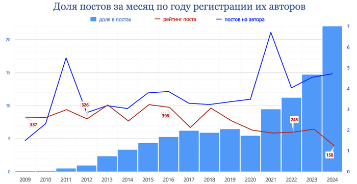 31,4% постов, написанных 35,2 процентами от всех авторов с постами, попали в Горячее.