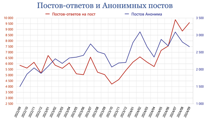 Постов-ответов на пост написано 9 596 (9,8%, на 8% больше к предыдущему месяцу).