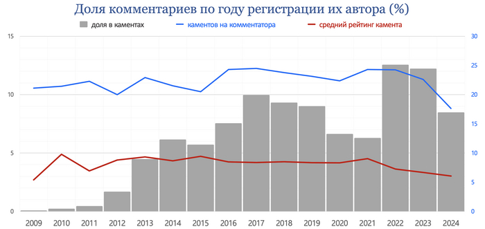 Из всех комментариев 1 104 имели рейтинг выше 1 000, 3 022 - от 500 до 1 000, 34 729 (1,0%) - от 100 до 500, 2 835 575 (80,7%) от 0 до 100. С отрицательным рейтингом - 471 850 (13,4%) комментариев.