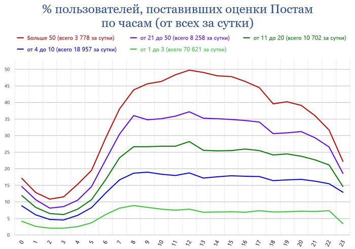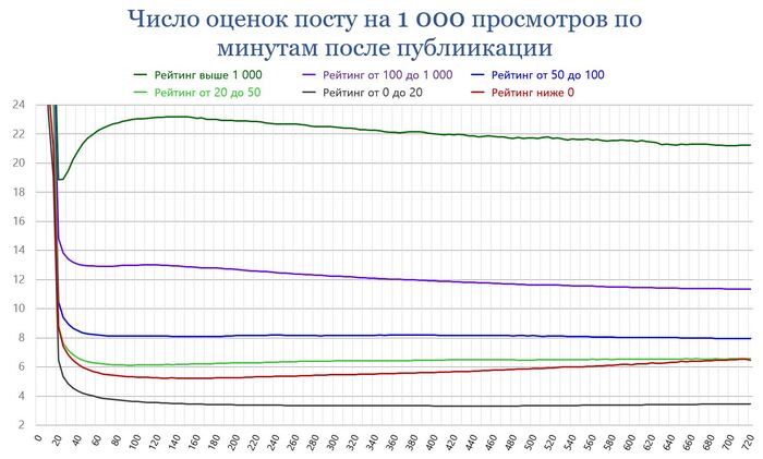 Понятно, что не все оценки этих пользователей поставлены постам в течение суток с момента их публикации. Но как мы помним из графика с маленькими столбиками (% плюсов и минусов, набираемых постами за 12, 24 и 48 часов), в зависимости от итогового рейтинга, за сутки посты получают от 70 до 80% всех своих финальных оценок.