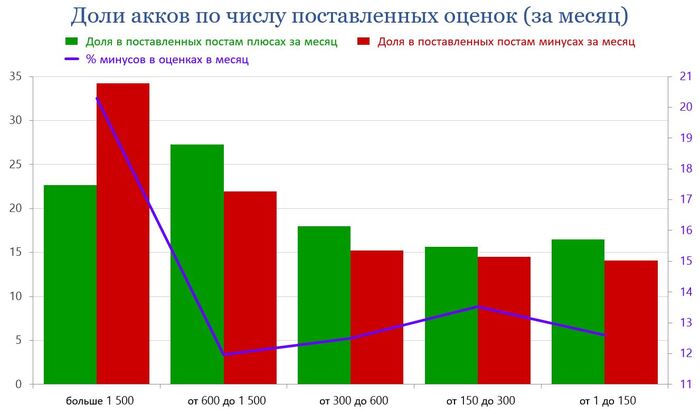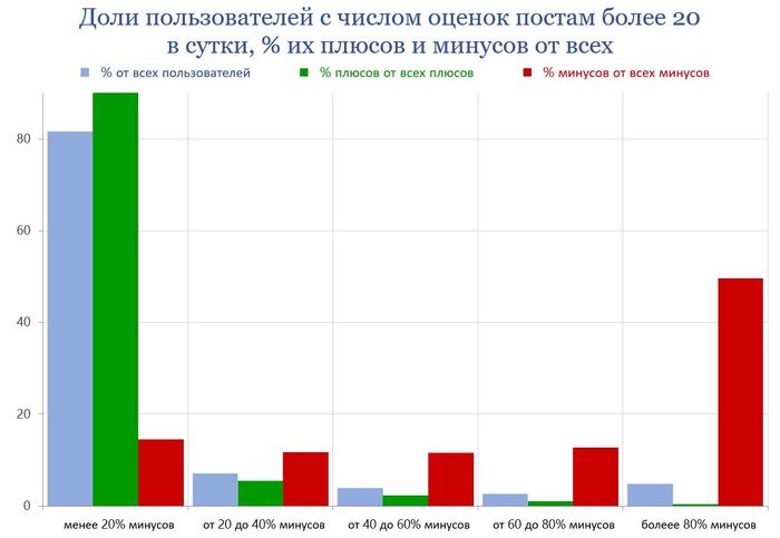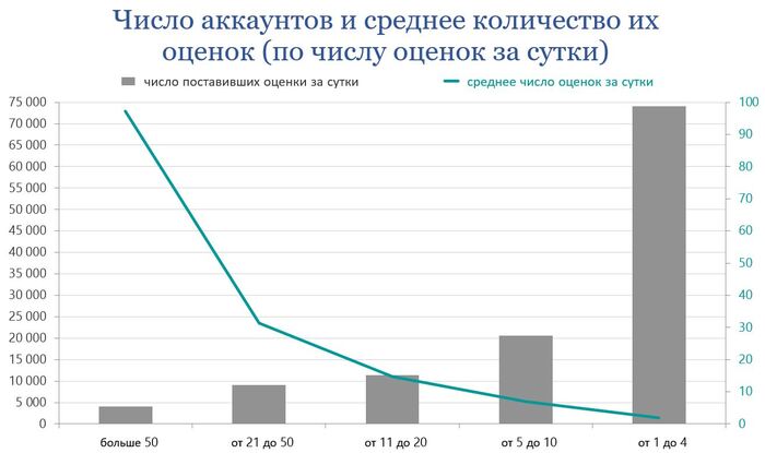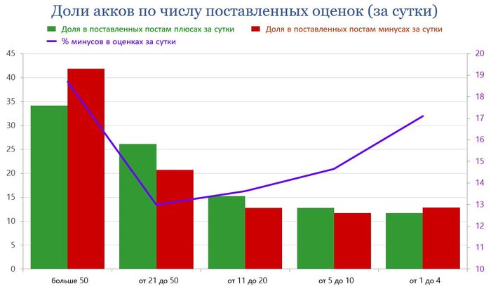 Выходит, что аккаунты, ставящие от 21 и более оценок за сутки, обеспечивают более 60% всех плюсов и минусов постам.