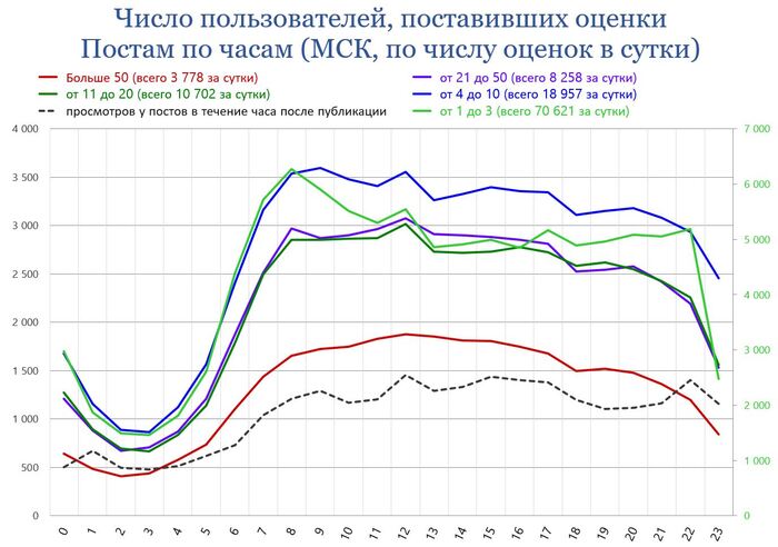 Очевидно, что просмотры постов и оценки им проставляемые активно растут какой-то не очень продолжительный отрезок времени – пока находятся в топах лент.