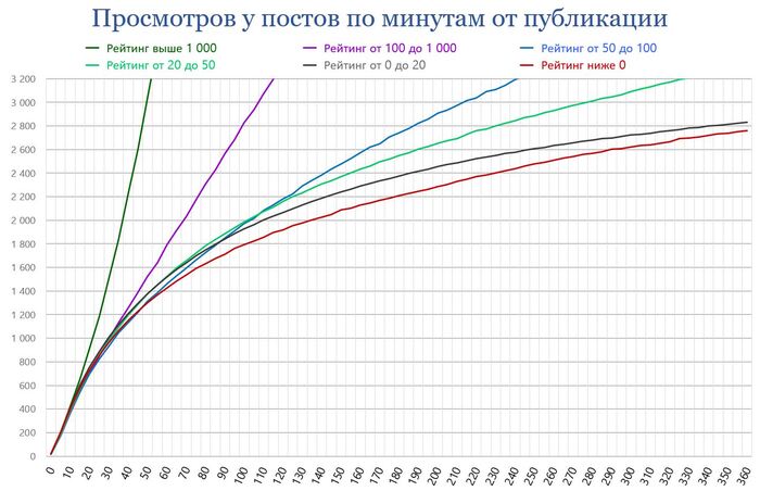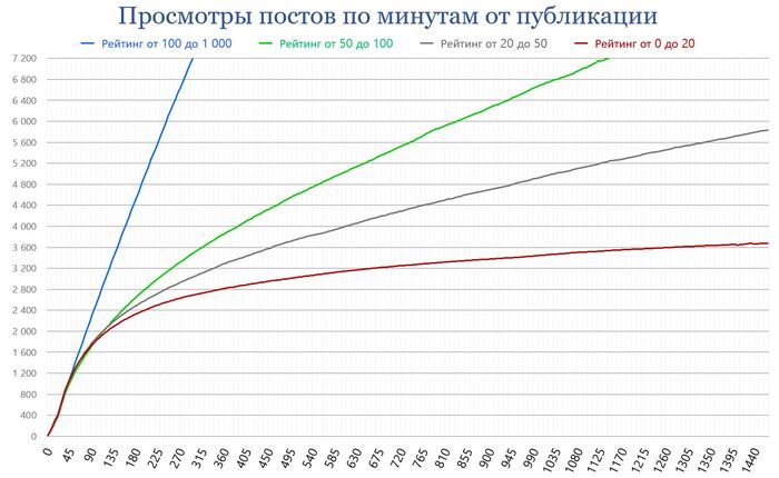 В течение первых 60 минут львиную долю просмотров обеспечивает лента «Свежего». Там посты, набирающие итоговый (за месяц) рейтинг выше 1 000, через 15 минут после публикации и после 500 просмотров начинают попадать в «Горячее», где уже и получают основной прирост просмотров и оценок. То же самое и у постов с итоговым рейтингом от 100 до 1 000 – у них выход в «Горячее» начинается с 40-й минуты после 1 200 просмотров.