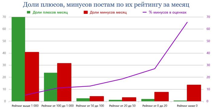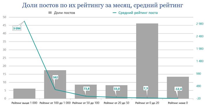 Посты с рейтингом выше 1 000 полючают 70,2% всех плюсов и 41,3% всех минусов всем постам за месяц. Посты с рейтингом выше 100 и до 1 000 – 23,6% всех плюсов и 31% всех минусов. С рейтингом от 50 до 100 – 2,52 и 3,94 %, от 20 до 50 – 1,73 и 2,83 %, от 0 до 20 – 1,88 и 7,59 %, ниже 0 – 0,63 и 13,28 %.