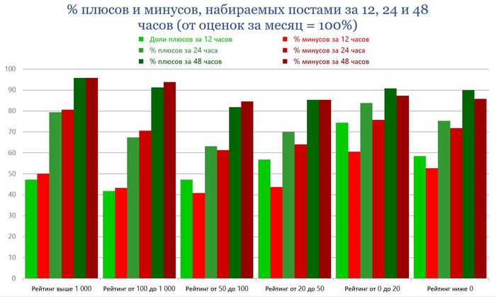 Например, за 12 часов с момента выхода поста (светлые столбцы слева) больше всего плюсов и минусов – 74,4 % и 60,6% от месячных значений набирают посты с рейтингом от 0 до 20. А за 48 часов – посты с рейтингом выше 1 000 – 95,8%.