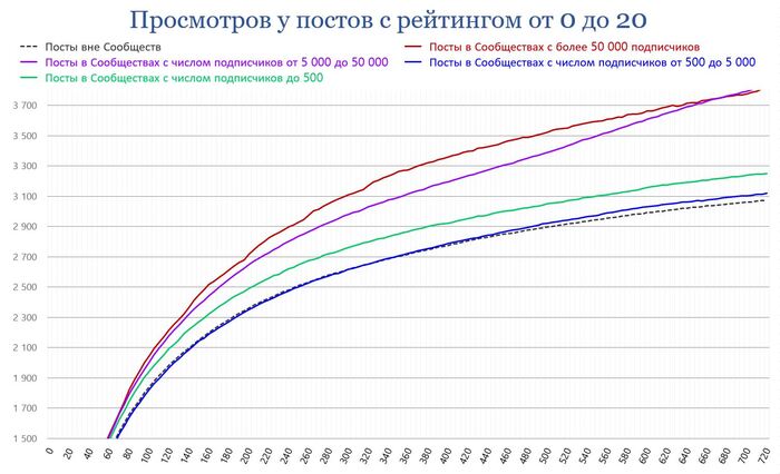 были взяты посты с итоговым рейтингом от 0 до 20 (большинство из них не попали в Горячее и не получили просмотров оттуда) и разделены по тому, сколько подписчиков у Сообщества, в котором они были опубликованы. Посты вне сообществ – черный пунктир.