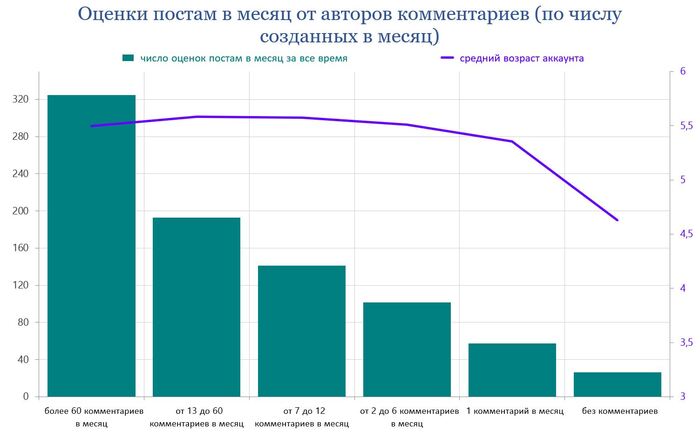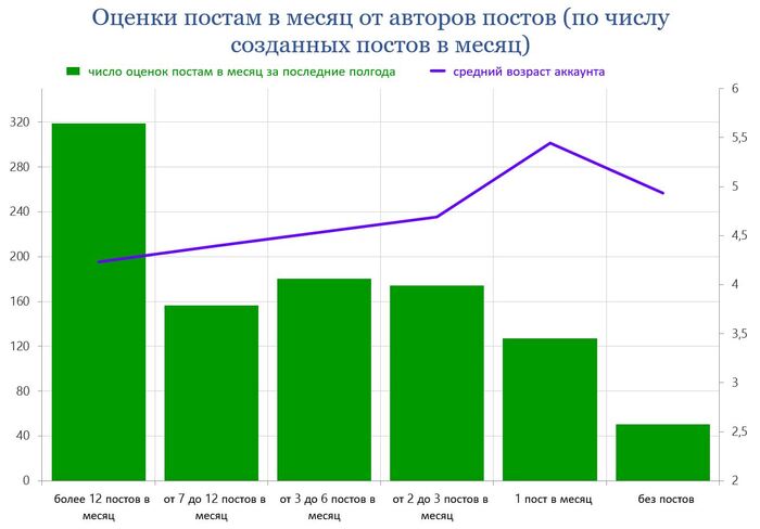 Интересна статистика по количеству оценок, выставляемых аккаунтами, в зависимости от числа публикуемых ими постов и комментариев.