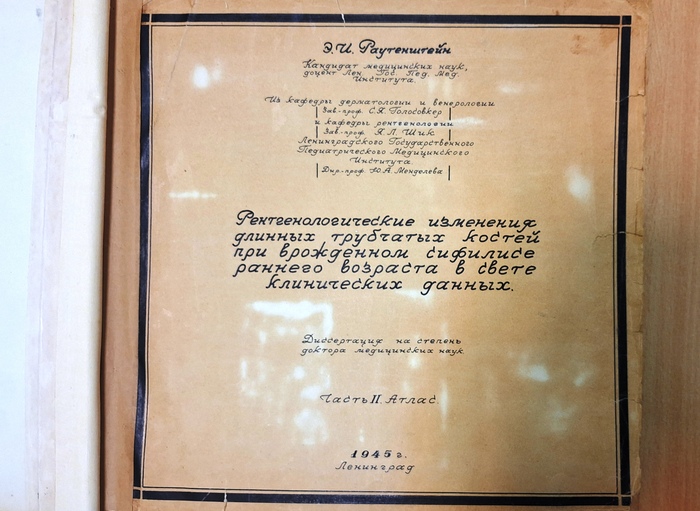 - Поскольку еще не было пенициллина, лечили ртутными препаратами, эффективность лечения была низкой. Массовое производство и широкое использование пенициллина началось во время Второй мировой войны, примерно с 1943 года. Это стало настоящей революцией в медицине, позволившей спасти миллионы жизней и эффективно лечить ранее смертельные бактериальные инфекции. Наша кафедра, как и весь Педиатрический институт, эффективно работала в годы войны, проводились научные исследования, писались диссертации. Вот, например, докторская диссертация доктора Эсфиль Исааковны Раутенштейн «Рентгенологические изменение трубчатых костей при врожденном сифилисе раннего детского возраста», которую врач готовила именно во времена блокады и защитила в 1945-м году. Эта работа актуальна и сегодня, то есть, симптомы сифилиса рентгенологически не изменились. И самый лучший способ диагностики сифилиса после обнаружения трепонемы, это рентген длинных трубчатых костей.