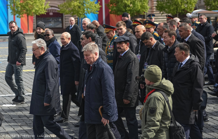 Вместе с главой Российского государства Владимиром Путиным на трибуне находились президент Беларуси Александр Лукашенко, президент Казахстана Касым-Жомарт Токаев, президент Кыргызстана Садыр Жапаров, президент Таджикистана Эмомали Рахмон, президент Туркменистана Сердар Бердымухамедов, президент Узбекистана Шавкат Мирзиёев, президент Кубы, глава государства – наблюдателя при ЕАЭС Мигель Диас-Канель Бермудес, президент Республики Гвинея-Бисау Умару Сиссоку Эмбало, президент Лаосской Народно-Демократической Республики Тхонглун Сисулит.