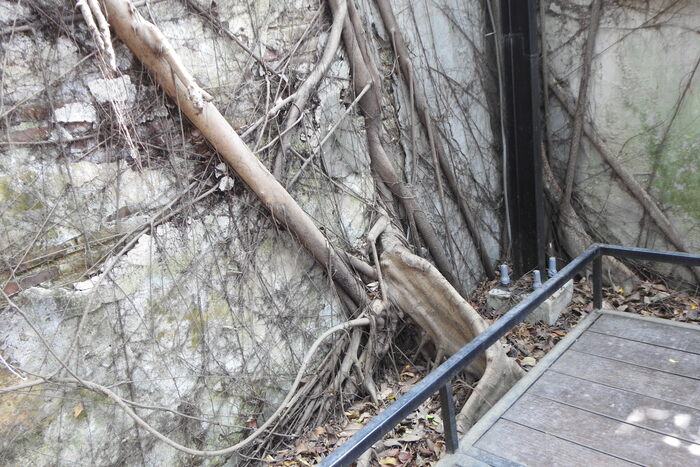 Их раскидистые корни и ветви покрывают стены и окна здания, переплетаясь с кирпичом и штукатуркой, как если бы они были частью первоначального архитектурного замысла.