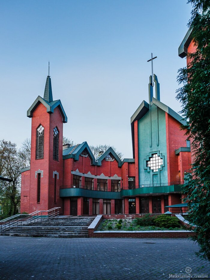 Кирпичное здание с серой крышей в стиле постмодернизма выделяется своими угловатыми формами. Даже традиционное окно-роза над входом имеет многоугольную форму. В фундамент заложен крест из обломков разрушенной кирхи, который был найден во время штурма Кёнигсберга.