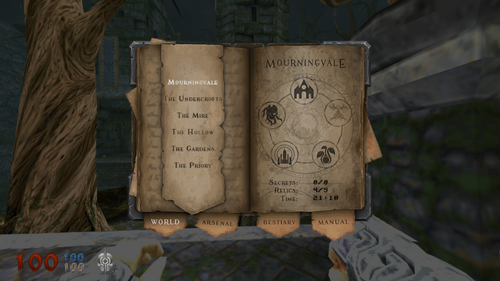 Отдать должное хочется местной архитектуре и дизайну локаций, с кучами секреток, отсылок, обходов и тому подобного. Этого - хоть завались, жаль только награда обычно - пачка патронов/броня/расходник. Да, старая школа, все дела, но чего бы не спрятать парочку апгрейдов для оружия? Здесь есть своя уникальная механика™, да. Одноразовые артефакты, дающие временные эффекты - вампиризм, неуязвимость, дыхание под водой, приманка. И всё бы ничего, только учитывая их ограниченность, про них либо забываешь, либо хочется отложить на “попозже”. Более того, один из артефактов ставит купол, что отражает вражеские снаряды. Круто? Да. Но снова - минус динамика. А еще игра - чертовски тёмная. Выкручивайте гамму и яркость на максимум.