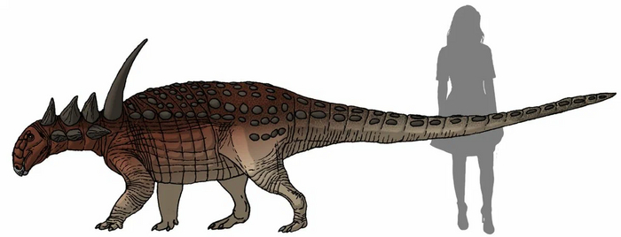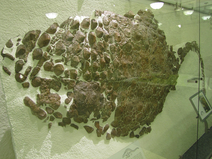 Зато над защитой рептилия мелового периода поработала тщательно. Её хвост, спина, шея и затылок были покрыты мощной костяной бронёй, состоящий из больших куполообразных чешуй и мелких косточек между ними. Всё это добро срослось в монолитный панцирь, присыпанный сверху шипами.