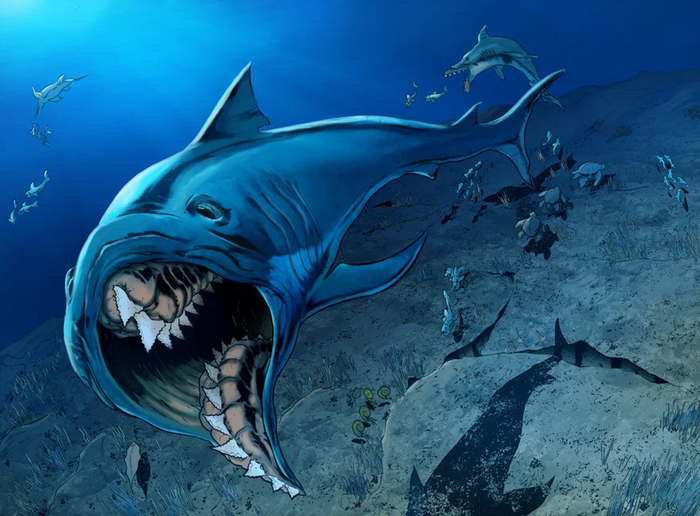 Дальше — сложнее. Палеонтологам потребовался почти век, чтобы оценить хотя бы примерные размеры и форму тела рыбины. Получилось солидно: 7-9 метров длины, акулоподобные формы и челюсти, выглядящие как больная фантазия художников-фантастов.
