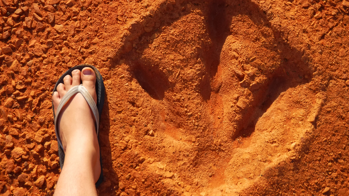"След динозавра (справа) на мысе Гантом-Пойнт на северо-западе Австралийского континента (штат Западная Австралия). В периоды отлива здесь обнажается множество отпечатков флоры и фауны Нижнего мелового периода"