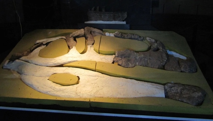 Частичный череп голотипа MUCPv-Ch1(восстанавливаются белые части) с левым зубным фоном на заднем плане, Палеонтологический музей Эрнесто Бахмана