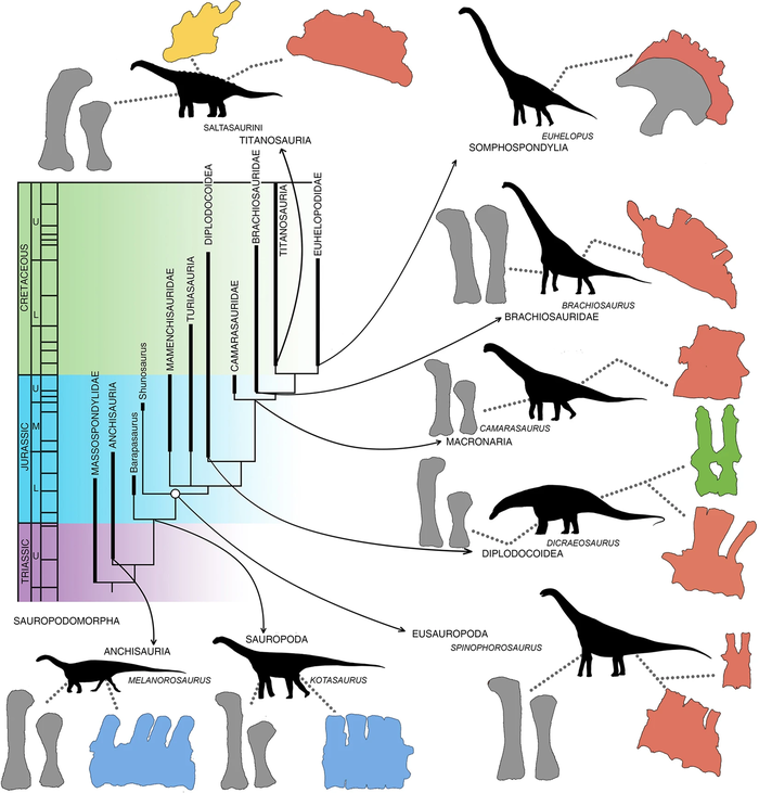 Зауроподы начинают свою историю с триаса, более 200 млн лет назад, а заканчивают её вместе со всеми нептичьими динозаврами на мел-палеогеновой границе, 66 млн лет назад. На протяжении почти 150 млн лет характерные черты зауроподов не менялись: четырёхногие, крупные динозавры с длинной шеей и хвостом. Размеры могли быть разнообразными: от островных карликов европазавров весом в тонну до исполинских аргентинозавров весом более 50 тонн. Также в эволюции наблюдаются как значительное удлинение шеи или хвоста, так и их укорачивание. Но в целом тенденция у них остаётся одинаковая во все времена мезозоя.