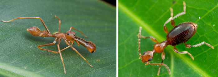 Паук-скакун Myrmarachne (слева) и жук-быстрянка (справа), подражающие муравьям. Фото © Kurt (Orionmistery) G и © Nicky Bay с сайта flickr.com