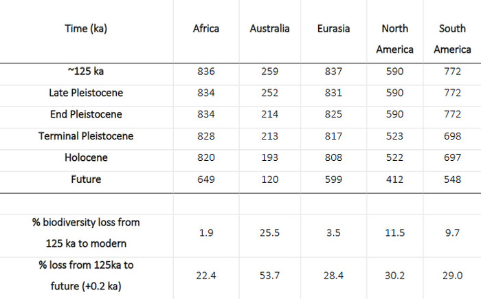 Рис. 2. Изменение числа видов нелетающих наземных млекопитающих на разных континентах в течение позднего плейстоцена. Нижние две строки показывают, на сколько процентов снизилось видовое разнообразие с начала позднего плейстоцена по настоящее время, а также ожидаемые потери в будущем, если вымрут все «краснокнижные» виды. Таблица из дополнительных материалов к обсуждаемой статье в Science