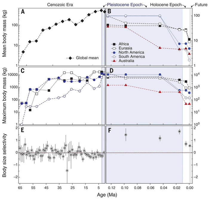 Результаты в целом хорошо согласуются с идеей о решающей роли людей в позднечетвертичном вымирании. Этот вывод становится еще очевиднее при детальном рассмотрении полученных данных. На рис. 3 показана динамика средней и максимальной массы тела млекопитающих в течение кайнозоя, в том числе отдельно по континентам. Видно, что вплоть до плейстоцена млекопитающие в среднем становились всё крупнее. Росла как средняя, так и максимальная масса тела существующих видов. Однако в позднем плейстоцене тенденция сменилась на противоположную.