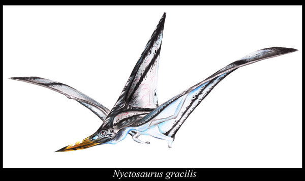 Удивительный никтозавр жил всего 85 млн лет назад на прибрежных территориях обеих Америк. Интересное в его внешности то, что ирокез превышал длину всего тела чуть ли не в два раза. Но все забывают о другом не менее интересном факте: никтозавр единственный из птерозавров, который лишился пальцев передних конечностей! Кроха был в длину 37 см, размах крыльев не достигал и 2 метров, а наросты на голове превышали полметра в длину.