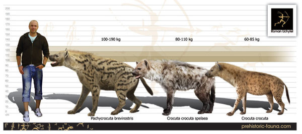 Сравнение размеров гиен. Слева направо: гигантская гиена, пещерная гиена, пятнистая гиена.