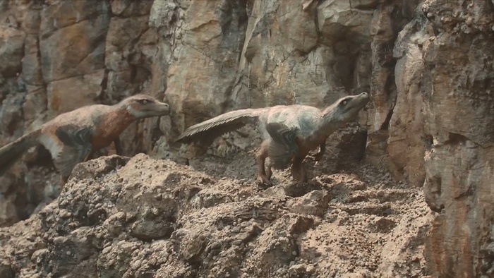Овираптозавры кориторапторы выглядят красиво и их частичное оптичивание вполне уместно. Чего не скажешь об охотящемся на них цяньцжоузавре, который петляет среди деревьев, координируя движения совершенно по-звериному, а не по-рептильному и даже не по-птичьи.