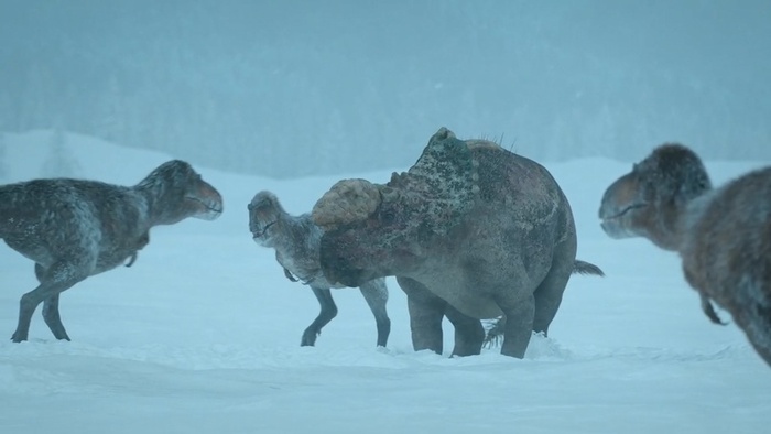 И вот, по не существовавшим в ту эпоху снежным просторам Аляски бредут безымянные гадрозавры (эдмонтозавры, как я понял). А на них охотятся дромеозавры и тираннозавриды. Как и в предыдущей серий, хищные динозавры представлены сверхумными "волками" мезозоя. Готов поспорить, не последнюю лепту в появление на экране подобных глупостей внёс один из консультантов сериала - Стив Брусатти. При всём уважении к нему, трудно воспринимать серьёзно его экстравагантные высказывания о том, что ти-рекс обладал уровнем интеллекта, сопоставимым с шимпанзе.