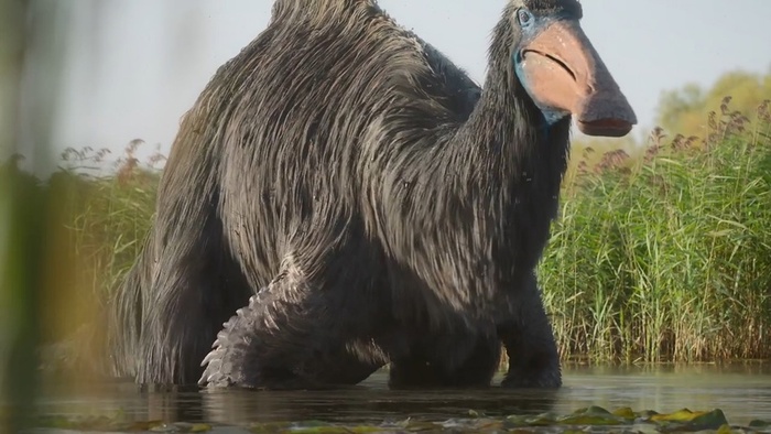 В третьей серии нам всё-таки соизволили показать некие "среднеазиатские" болота. В болото поместили дейнохейра - гигантского орнитомимозавра, найденного как раз в монгольской Гоби . И всё бы хорошо, но один момент испортил впечатление: динозавр на экране с ног до головы покрыт "шубой" из волосообразных протоперьев. Я догадываюсь, почему так: сразу после того как был пролит свет на истинный облик этого гиганта, практически непохожего ни на одного другого динозавра, в сети появилось несколько рисунков, на которых дейнохейр закован в протоперья по принципу "раз его родственник орнитомим был покрыт перьями, оденем-ка в перья и самого дейнохейра". А создатели сериала взяли да и скопировали увиденное в интернете. Хотя в данной ситуации следовало бы сначала подумать, а потом что-то делать. Ведь тот же шерстистый мамонт - ближайший родственник индийского слона (даже более близкий, чем слон африканский). Но это же не означает, что индийский слон должен быть облачён в "шубу"! Монгольские болота мелового периода - это не современная пустыня Гоби, но всё равно та ещё парилка, по климатическим условиям напоминавшая болота и джунгли современной Юго-Восточной Азии. Вот и получается, что "медвежья шуба" нужна была дейнохейру настолько же, насколько она нужна индийскому слову или индийскому носорогу.
