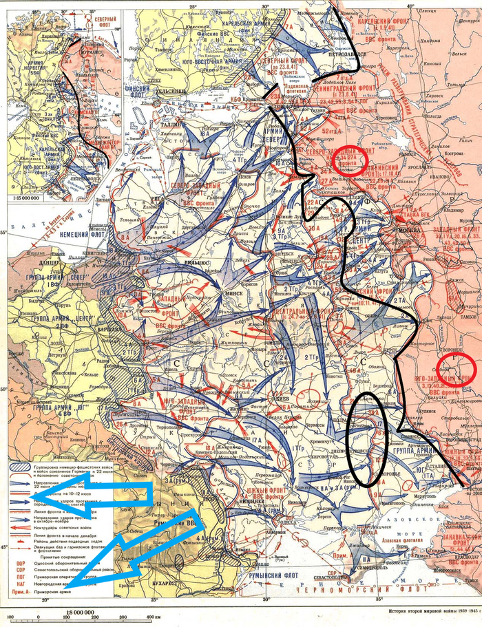 Немецкая карта Крыма от 25 июля, видим в основном, румынские охранные дивизии по побережью. Основные немецкие дивизии находятся через пролив на Таманском полуострове на так называемой "Голубой линии", в это время там же находится Л.И.Брежнев, который позже напишет книгу "Малая земля". Видны номера советских дивизий и соединений, разведка работала.