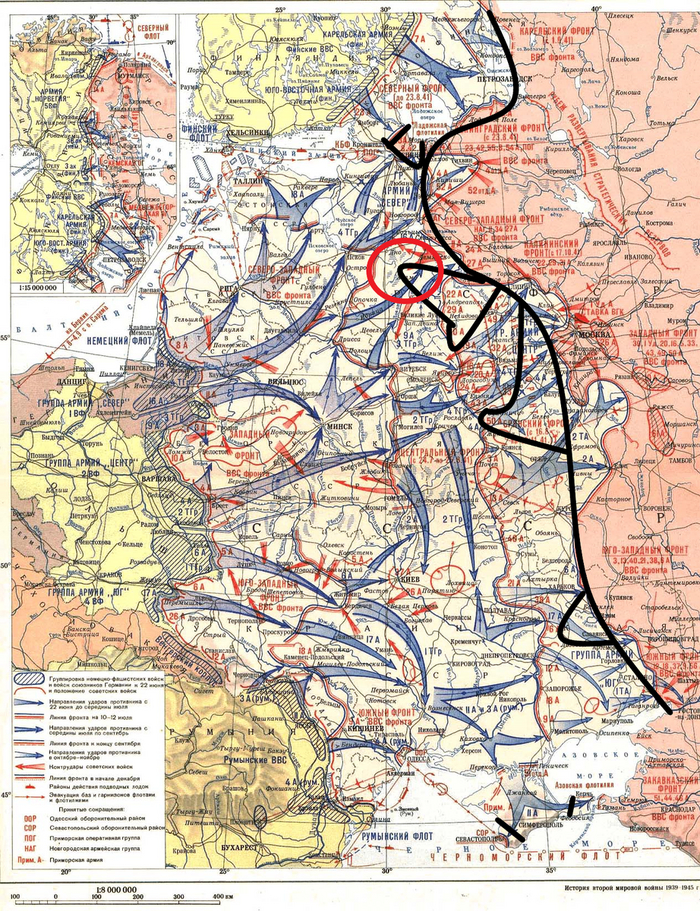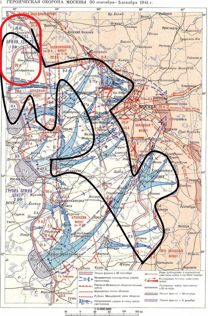 Прорыв советских войск к Вязьме. В красных кругах районы высаженных подразделений ВДВ и не соединившиеся с сухопутными войсками.