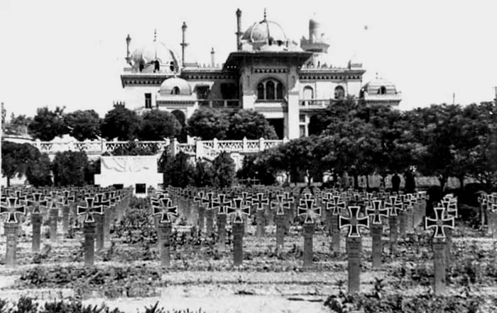 Оккупированная Феодосия. Немецкое кладбище у развёрнутого в 1942-1944-х годах военного госпиталя Вермахта в даче Стамболи (особняк российских предпринимателей начала 1990-х). Ныне дача Стамболи является объектом культурного наследия. Немецкое кладбище ликвидировано после Великой Отечественной войны.