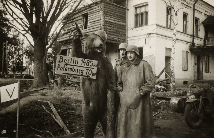 Находился этот мишка в селе Рождествено, Ленинградская область. На пятом и шестом снимках видно здание Рождественского ДК. Попал он сюда, предположительно, из усадьбы Набокова, где до войны было общежитие ветеринарного техникума.