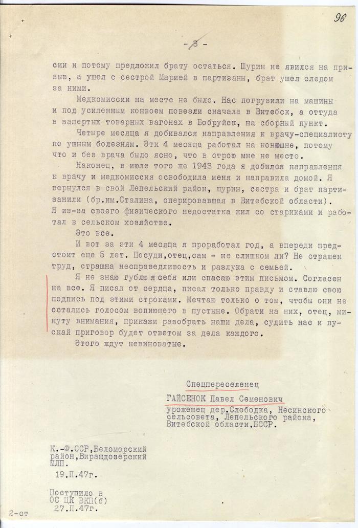 Спецпереселенцы Вирандозерского механизированного лесопункта просят Сталина о справедливом суде.