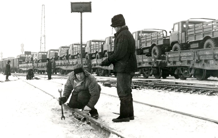 Погрузка в полувагоны автомобилей УралЗИС-355М, Уральский автозавод, город Миасс, Челябинская область, 1960 год: