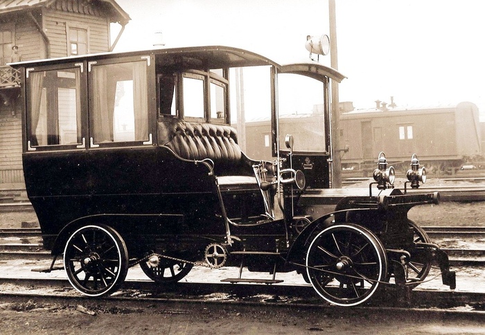 Автомобиль "Руссо-Балт", приспособленный для передвижения по железной дороге, 1902 год:
