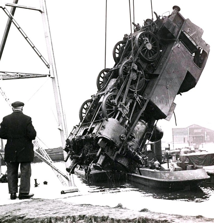 Подъём упавшего в реку паровоза, город Амстердам, Нидерланды, 1935 год: