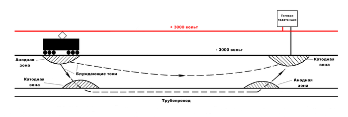 Так как имеется разность потенциалов между металлом (рельс, трубопровод) и землёй, в этих зонах возникает электролиз и происходит электрохимическая коррозия металла.