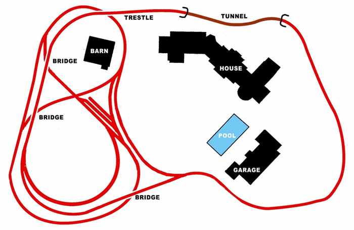 Железная дорога окружала дом (см. схему) и имела развилки, подъемы в гору и даже 27 метровый туннель, проходивший под клумбами цветов.